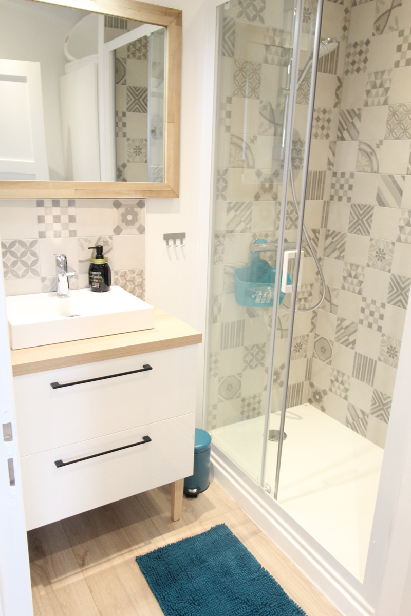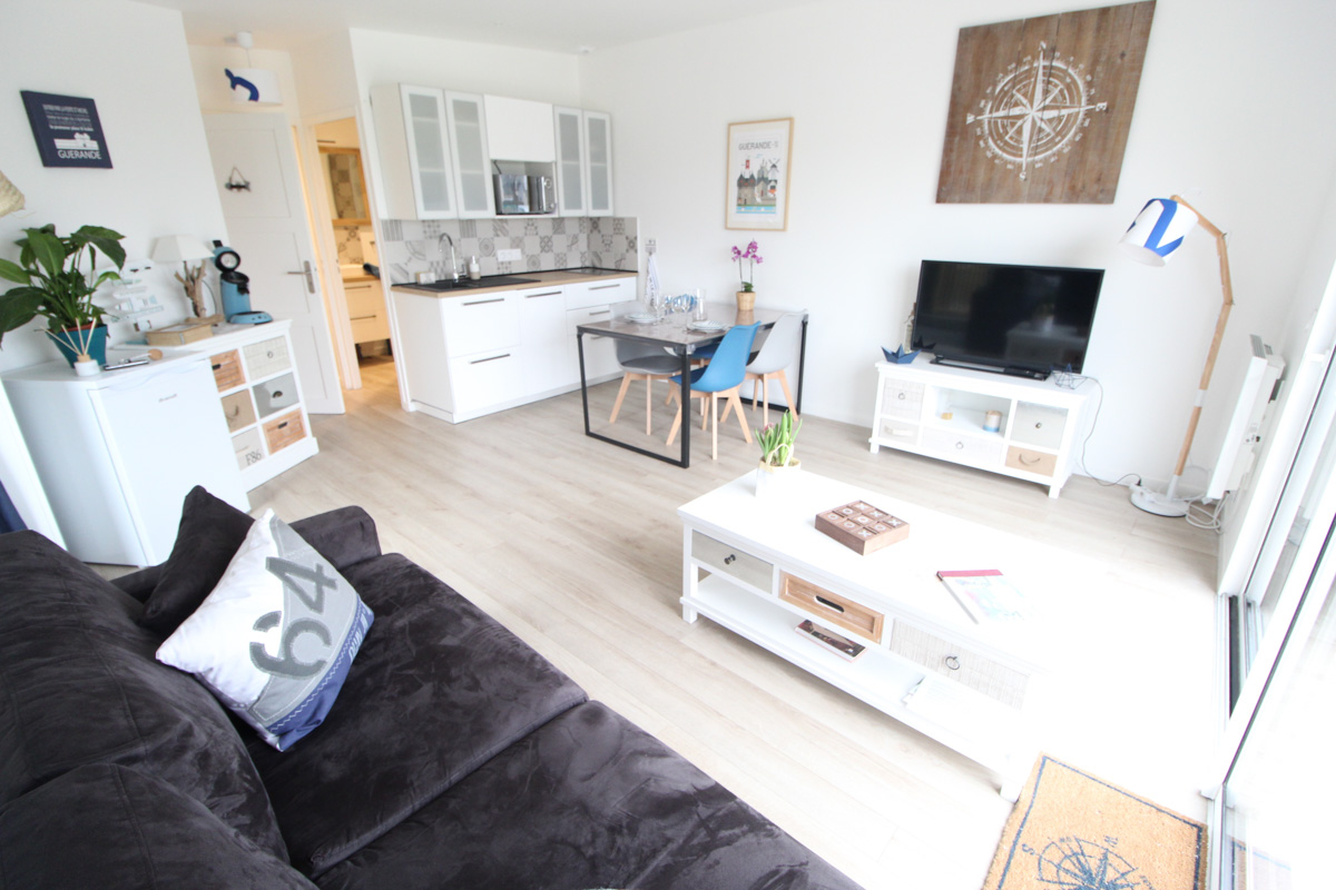 Plain pied: salon/séjour/cuisine aménagée, 1 chambre (2 lits 90×200 jumelés), salle d’eau et WC indépendant.